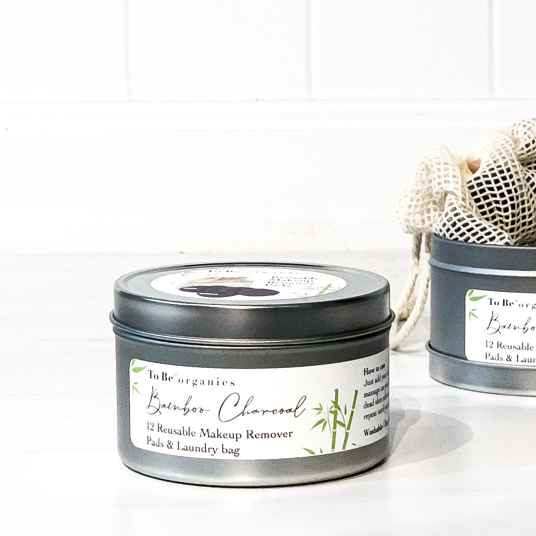 12 charcoal bamboo rounds, laundry bag and reusable aluminum storage tin.
